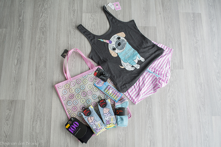 Donut tas (€2,-) – Pyjama unicorn hondje (€6,-) – Zwarte panty 100 den (€3,-) – Sokken met ijsjes (van €2,50 voor €1,- per pak) – 5 pack sokken (€3,-) – Haarclip (van €1,50 voor €0,50) – PEZ snoepjes (€1,50)