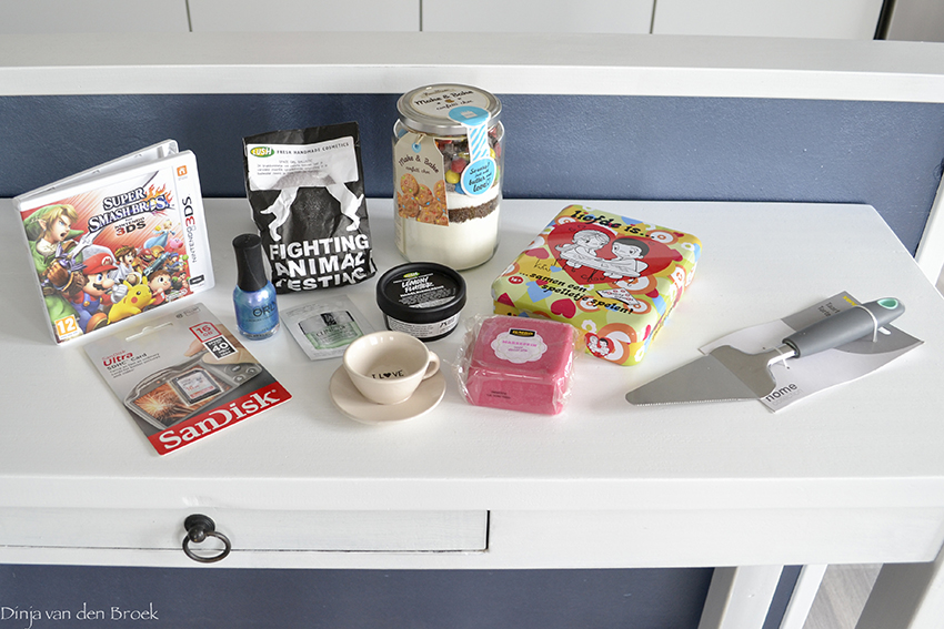 Super Smash Bros – Lush Space Girl – Hema confetti koekjes – Liefde is… spel – Taartschep – SD-kaartje – Nagellak – Proefmonstertje – Lush Lemony Flutter – Theezakjeshouder – Marsepein