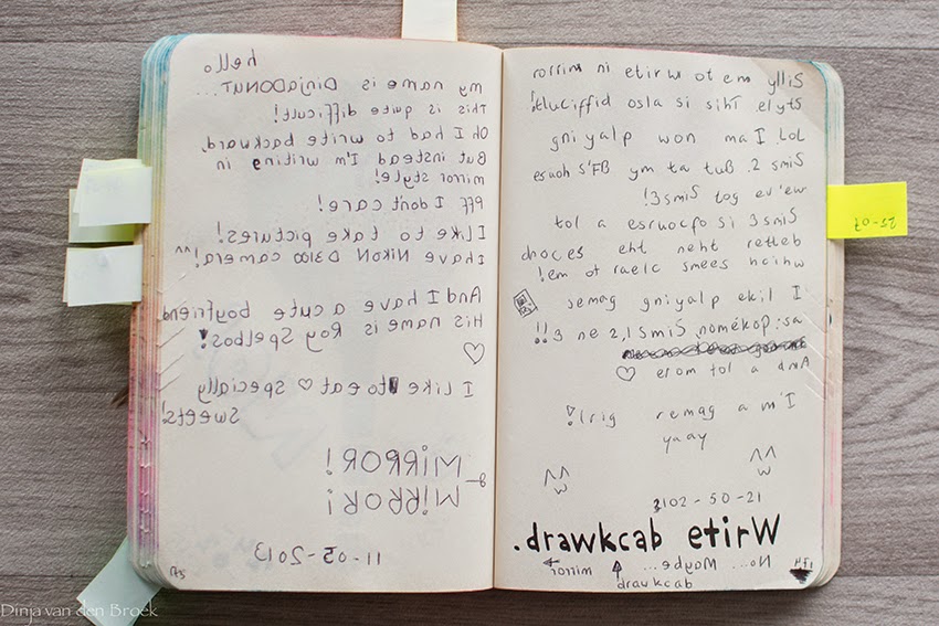 Ik heb deze opdracht eerst een beetje verkeerd opgevat. Ik dacht dat je in spiegelbeeld moest schrijven (zie links), toen ik halverwege ontdekte dat ik alleen de woorden achterstevoren moest schrijven.