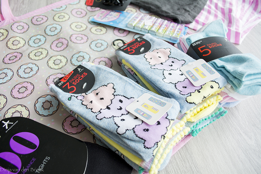 Donut tas (€2,-) – Pyjama unicorn hondje (€6,-) – Zwarte panty 100 den (€3,-) – Sokken met ijsjes (van €2,50 voor €1,- per pak) – 5 pack sokken (€3,-) – Haarclip (van €1,50 voor €0,50) – PEZ snoepjes (€1,50)