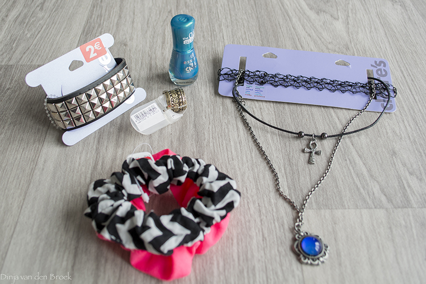 Studs armband (€2,- Claire’s) – Essence nagellak (€1,69 Kruidvat) – Set met kettingen (€9,99 Claire’s) – Ring (€4,95 Six) – Haar scrunchies (€2,- Claire’s)
