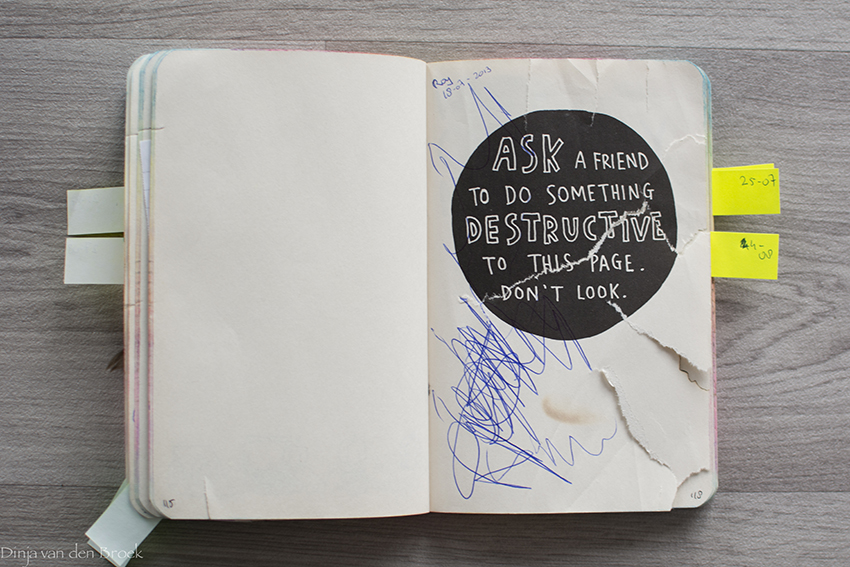 Tja Roy is flink losgegaan met deze pagina! Hij heeft erin gescheurd, gekrast met pen en zelfs heeft hij zijn aansteker bij mijn Wreck This Journal gehouden (foei Roy!).