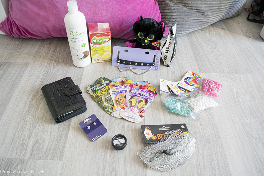 Inecto Pure Coconut shampoo (€1,98 Big Bazar) – Lemon pie thee (€0,99 Big Bazar) – Ketting (€6,99 Claire’s) – Vleermuis plushie (€8,99 Claire’s) – Yuzu and Cocoa Bubbleroon (€6,25 Lush) – Portomonnee (€2,99 Big Bazar) – Gezichtsmaskers (€1,49 per stuk en €4,- voor 3 Op=Op voordeelshop) – Zakjes met kralen (€0,99 per stuk SoLow) – Vlinder oorbellen (€7,95 Claire’s) – Scrub (gratis proefmonster Lush) – Glow in the dark beestjes (€1,25 SoLow)